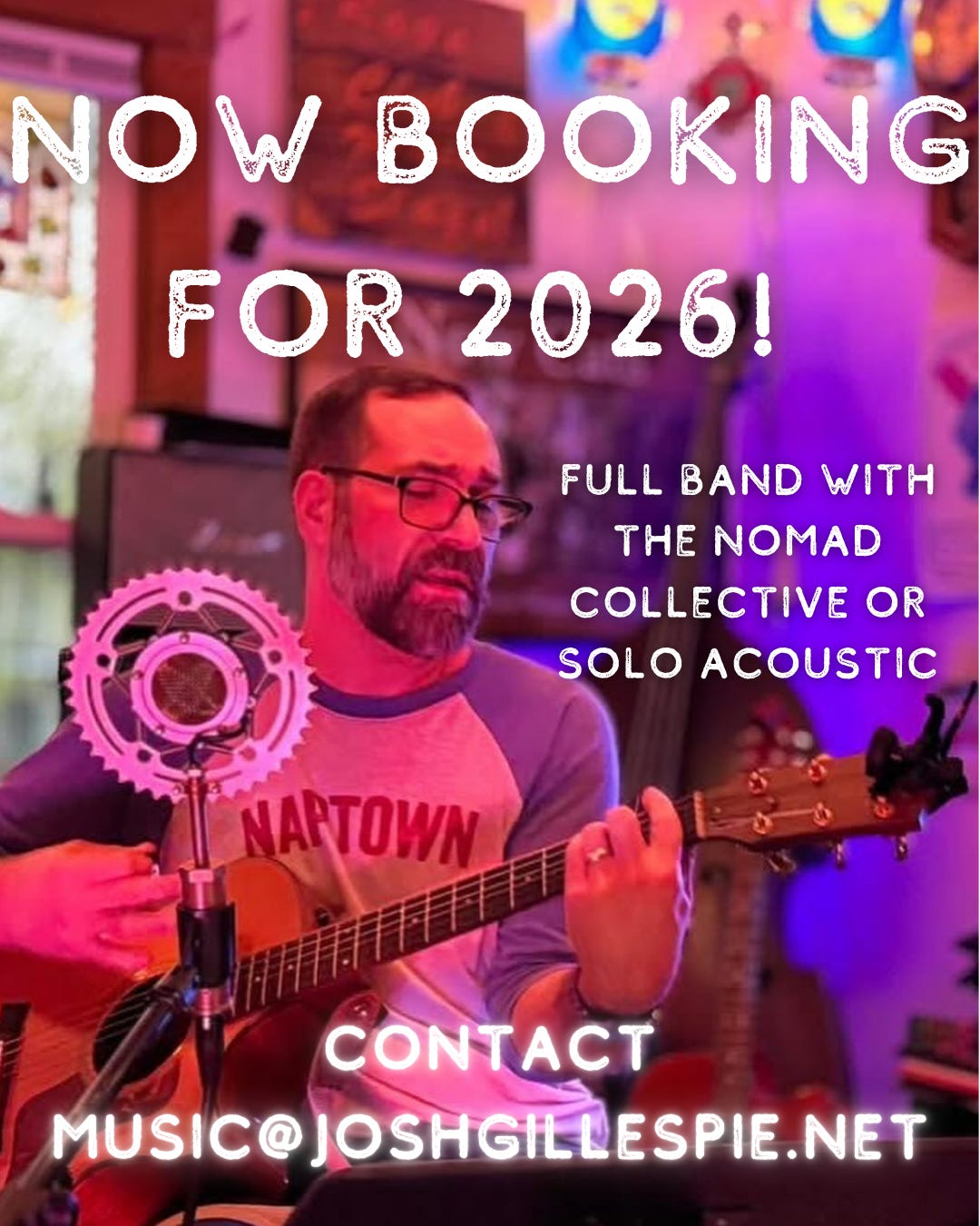 I’m booking for shows, be they full band or solo for 2026. From house shows to restaurants and bars and venues, I want to bring my music to you. Let’s set something up. Message me or send me an email at music@joshgillespie.net. Have guitar will travel!