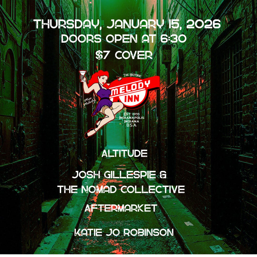 So far, only one show to announce and that’s coming up and it’s on Thursday, January 15th 2026 at the Melody Inn. It’s a full band performance with the Nomad Collective! Joining us on the bill will be the AMAZING Katie Jo Robinson (one of my personal local favs), Aftermarket (a great band headed up by the extremely talented and lyrically prolific Aaron Lipp) and Altitude, a band I haven’t heard, but I’m really looking forward to. Doors open at 6:30pm, show starts at 7:00 and my band goes on at 8:30. Totally early enough for you to come out and see us. The door is $7 to get in. Pretty affordable for this lineup if you ask me! Hope to see you there.
